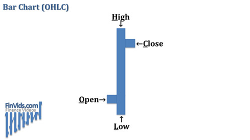 The bar chart or OHLC (Open, High, Low, Close) chart is a way to summarize price movement during a set period of time. The Open is signified by a horizontal "tick" mark on the left side of the vertical line bar. The Close is the horizontal tick mark on the right side of the vertical line bar. The High is the very top of the vertical line bar; and the Low is the very bottom of the vertical line bar. The position of the Open and Close varies depending on where the opening price and closing price are in relation to the rest of the bar prices. Note that for the rest of this article, daily (typically 9:30AM Eastern Standard Time to 4:00PM) price bars will be implied in all discussions; although price bars can be any time frame from one minute to one hour to daily to weekly and to monthly.