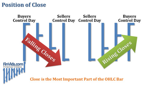 The Close is by far the most important price of the four OHLC prices. The Close can be viewed as the summary of the day's trading. The location of the close on the price bar can suggest whether buyers or sellers are in control of the day. When prices close near the high, it can be inferred that buyers won the day; when prices close near the low, it can be inferred that sellers won the day; and when the close is at the center of the price bar, neither side is winning.