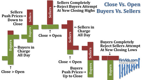 The Open is the price at which the first few trades between buyers and sellers occur. The Open price is important mainly in its relation to the prior price bar's close and the current price bar's close. If the open is higher than the previous day's close then there is a price gap up. Typically there is positive news on a stock or maybe buyers were unable to get into the stock at the prior day's close and want to make sure they buy at the open – all of these reasons can push prices up overnight. The Open in relation to its Closing price will be discussed in the Close paragraph.
