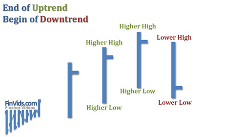 After a series of higher highs and higher lows creating an uptrend, when price bars make a lower high and lower low, this could be a signal of a potential reversal of price action. Typically, these reversal bars with lower highs and lower lows should make a drastic break from the prior uptrend to be considered valid. See the chart example at the end of this page for a real life example.
