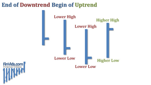 After a series of lower highs and lower lows that create a downtrend, if price bars make a higher high and higher low, this could be a signal of a potential reversal of price action. Typically, these reversal bars with higher highs and higher lows should make a drastic break from the prior uptrend to be considered valid. See the chart example at the end of this page for a real life example.