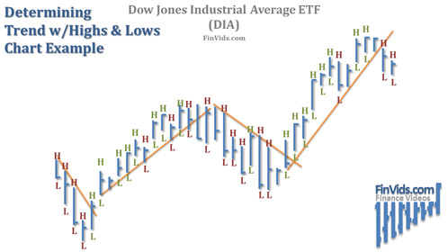 Typically, the definition of a trend is based on the relationship of highs and lows; therefore, if over time prices have higher highs and higher lows, then price bars are moving in an uptrend. See the trendlines page for more information on creating uptrend trendlines and the buy and sell signals associated with those trendlines.