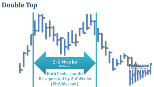 According to Bulkowski (2005), the two high prices should be within 3-5% of one another and should be separated in time by 2 to 7 weeks; anything over 8 weeks and the success of the pattern begins to deteriorate; within a small variation, double tops tend to perform best when they occur within the top third of the yearly high price. Once prices penetrate below the price level established by the trough, then a sell signal is suggested.