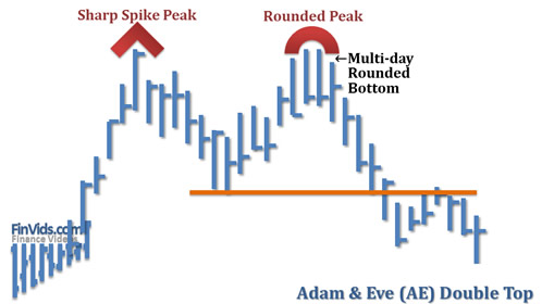 There are four anatomically suggestive double top patterns: Adam & Adam, Adam & Eve, Eve & Adam, and Eve & Eve. Topping price bars that are sharp "A"s, usually one day events, are referred to as "Adam"s. Whereas, rounded "n"s that are usually multiple day bottoming bars are referred to as "Eve"s.