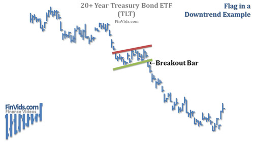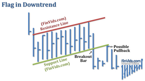 A flag in a downtrend is the opposite. Prices fall, followed by a short retracement channel higher and then an expected breakdown below support of that channel.