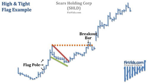 A high and tight flag pattern is illustrated on the chart above of Sears Holding Corp (SHLD). The beginning of the flagpole actually occurs at the end of a downtrend. The flagpole from the base to the peak was 90% over 18 days; notice that the price rise was continually up with no real retracements or periods of consolidation. From the peak of the flagpole, the low of the 25% retracement occurred 6 days later; notice that the retracement (high to low bars) were quite short/tight. The breakout occurred 13 days later when prices closed above the flagpole's peak price. From the breakout price, 29 days later, prices gained 56%.