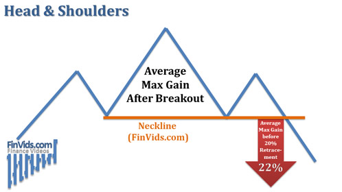 The Head and Shoulders top reversal pattern is the best performing chart pattern in a bull market, according to Bulkowski's (2005) research with an averaged maximum decline of 22%. The head and shoulders pattern consists of three "A" peaks, with the first and third peak being roughly equal in height and the second or middle peak being higher than the first and third peaks. A head and shoulder pattern has two armpits or troughs that are low prices between the first shoulder peak and the middle head peak and the middle head peak and the last shoulder peak.