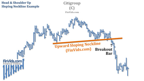 However, for an upward sloping neckline head and shoulders pattern, the second trough created by a retracement from the head peak is still a higher low and suggests that the uptrend is still intact. Not until the right shoulder fails to make a higher high do traders begin to worry. When the neckline is broken below on an upward sloping neckline head and shoulders pattern, essentially the upward sloping support line of the prior uptrend has been broken.