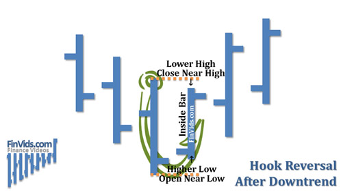 The hook reversal at a bottom is the opposite. The pattern occurs after a downtrend. The first day has a lower low and lower high continuing the downtrend with prices closing above the open. The next day is an inside day where prices open below the prior day's high and then fall further down and close near the low of the day, but still above the prior day's low price. The hook reversal bottom is roughly equivalent to the bullish harami pattern.