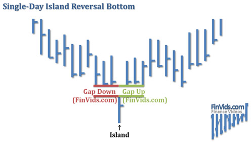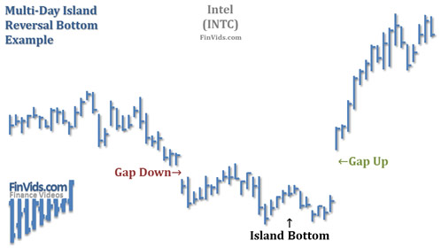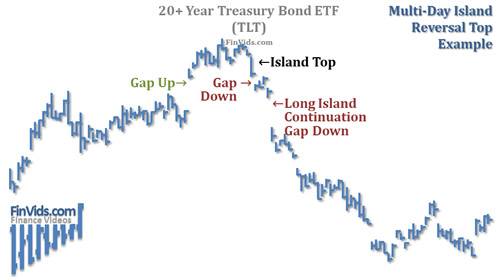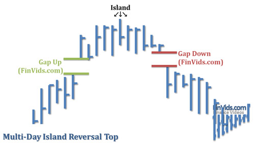 Multi-day Island Reversals are groups of price bars that are separated by a gap up and then gap down (in the case of an island reversal top) or separated by a gap down and then a gap up (in the case of an island reversal bottom).