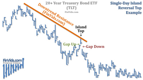 The chart above of the 20+ Year Treasury Bond ETF (TLT) illustrates a single-day island reversal top. The overall trend prior to the pattern was a downtrend, but the immediate trend prior to the island reversal was an uptrend. Prices rose prior to the pattern and then gapped up. Prices hit the overhead resistance established by the larger scale downtrend and then fell and closed near the low of the day. The pattern was completed with a large gap down. Prices then fell even further until they hit the downtrend's support line. Overall, the island reversal pattern combined with the downtrend channel would have made for a great trade.