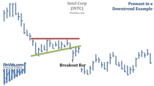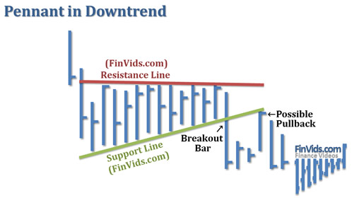 A pennant in a downtrend is the opposite. Prices fall, followed by a short retracement triangle higher and then a sell signal is triggered when prices breakdown below support of the pennant.