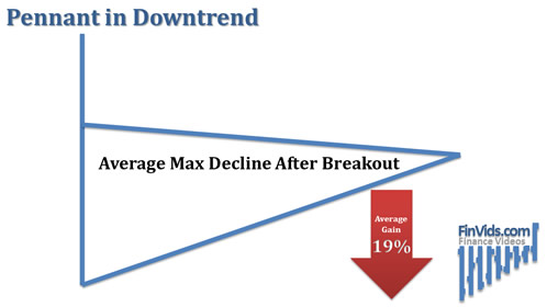 Whereas a pennant in a downtrend has an average decline of 19% (Bulkowski , 2005). A pennant should occur within a few weeks, any longer and it is considered a triangle pattern.