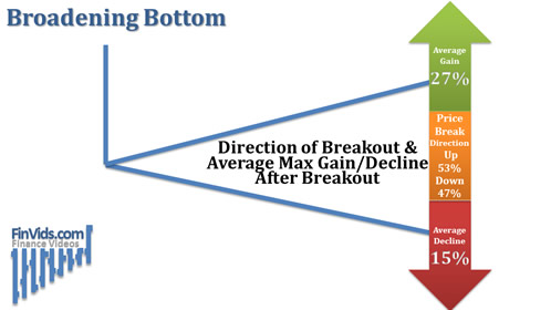 Prices in the broadening bottom pattern breakout above about 53% of the time and breakout below about 47% of the time; when prices breakout above, prices eventually rise to an averaged maximum gain of 27% before the first 20% reversal; and when prices breakout below support, prices decline by an averaged maximum of 15% (Bulkowski, 2005).