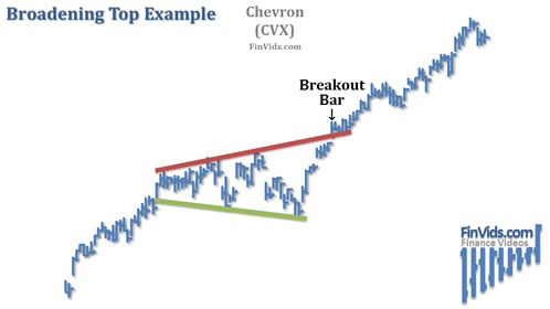 Again, the chart of Chevron (CVX) contains a broadening pattern, in this case a broadening bottom pattern because prices enter the pattern from above. There are three higher highs and four or five lower lows. Prices break below support and move downward enough to complete a profitable trade using either price target method.