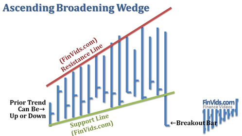 The ascending broadening wedge occurs when prices make higher highs and higher lows; each high and low should occur at least three times to create the proper support (line drawn below the lows, sloping upward and to the right) and resistance (line drawn above the highs, sloping upward and to the right, even steeper than the support line).