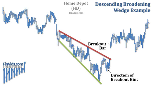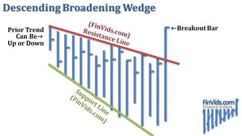 The descending broadening wedge occurs when both the resistance and support are trending down and to the right and the price range is broadening with time.