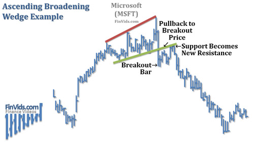 The only broadening pattern that Kirkpatrick & Dahlquist suggest trading is the ascending broadening wedge that breaks to the upside because of its negligible failure rates (2010, p. 320).