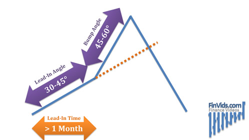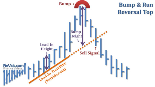 The bump and run reversal top begins with an uptrend approximately 30 to 45 degrees that lasts for at least a month period (this is called the "lead-in"); this is followed by an increase in steepness (approximately 45 to 60 degrees) called the "bump"; lastly, prices rollover and fall downward (the "run") to the 30 to 45 degree uptrend line established before the bump; once prices penetrate and close below the uptrend line, a sell signal is triggered (Bulkowski, 2005).