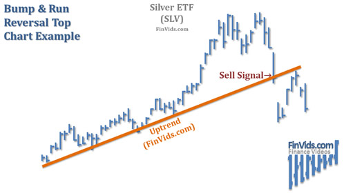 The chart above of the Silver ETF (SLV) illustrates a bump and run reversal top. The lead-in is an uptrend at a 36 degree angle. The trend then increases to roughly a 65 degree angle. Prices then create a mini double top by rolling over and then the same price bar that would signal a double top sell signal also triggers the sell signal of the bump and run reversal top which means the 36 degree angle was pierced and prices closed below it.