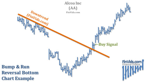 The chart above of Alcoa (AA) illustrates a bump and run reversal bottom. The downtrend is a 25 degree angle followed by a gap down and the creation of the bump bottom. Prices then rally back upward and then pierce and close above the prior 25 degree downtrend, triggering the buy signal.