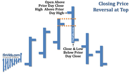 The closing price reversal at a top occurs during an uptrend. The closing price reversal bar typically gaps up at the open above the prior day's close and then falls downward closing within the previous day's price bar. The main requirement is that the close of the closing price reversal bar must be near its low and below the prior day's closing price. Note that this pattern does not show as much strength from sellers as the key reversal pattern because sellers were unable to make a lower low. In fact, technically, because the high of the closing price reversal bar has a higher high and has a higher low, the uptrend is still intact. In fact the only bearish trait is that sellers rejected the higher highs and prices closed near the low. The closing price reversal at a top is roughly equivalent to the candlestick version called the dark cloud cover.