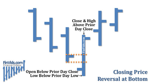 The closing price reversal at a bottom occurs during a downtrend. The closing price reversal bar typically gaps down at the open below the prior day's close and then rises throughout the day, closing within the previous day's price bar. The main requirement is that the close of the closing price reversal bar must be near its own high and be above the prior day's closing price. This pattern does not show as much strength from buyers as the key reversal pattern because buyers were unable to make a higher high. Moreover, because the closing price reversal bar has a lower high and has a lower low, the downtrend technically is still intact. In fact the only bullish attribute is that buyers rejected the lower lows and prices closed near the high. The closing price reversal at a bottom is roughly equivalent to the candlestick version called the piercing pattern.