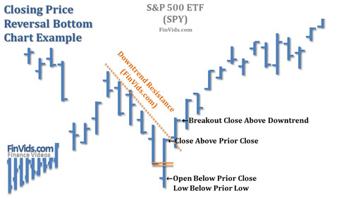 A closing price reversal bottom is shown at a bottom on the chart above of the S&P 500 ETF (SPY). There is a preceding downtrend of five bars with lower highs and lower lows. The closing price reversal bar gaps down opening below the prior day's low, prices move a little lower and find buyers. Buyers then push prices up closing near its high and far above the prior day's closing price.