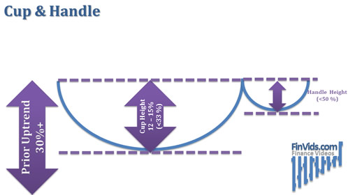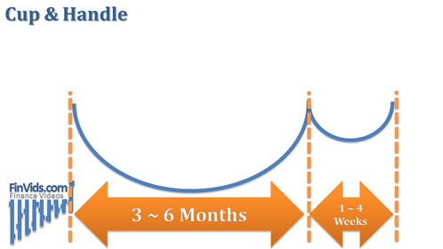 According to William O'Neil (2002), the cup and handle pattern usually forms prior to an uptrend of 30% or more and takes between seven and 65 weeks to form, but the majority are three to six months; in addition, the distance between the top of the cup and the bottom of the cup is 12% to 15% but can be up to 33% (p. 124). Kirkpatrick & Dahlquist state that typically volume decreases on the left side of the cup and then increases on the right side of the cup (2010, p. 325).