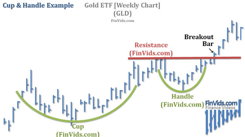 The chart above of the Gold ETF (GLD) illustrates an uptrend prior to the pattern, then a downtrend that bottoms out creating the left side of the cup and then a slow ascent creating the right side of the cup. Prices then break the uptrend established by the right side of the cup, thus creating the handle. Prices reverse in a "V" formation rising until the high established by the right side of the cup. Once that high is pierced, prices continued to rise.