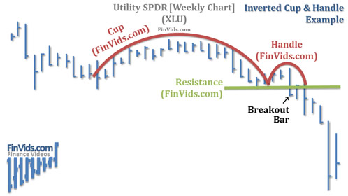 The chart above of the Utility SPDR ETF (XLU) illustrates an inverse cup and handle. After a downtrend, prices reverse in a gentle dome formation creating the cup. Prices change direction by retracing upward and then falling back to the support price level established by the low of the right lip of the cup. Once prices penetrate the low of the right lip of the cup, then a sell signal is triggered and in the chart above prices fall thereafter.
